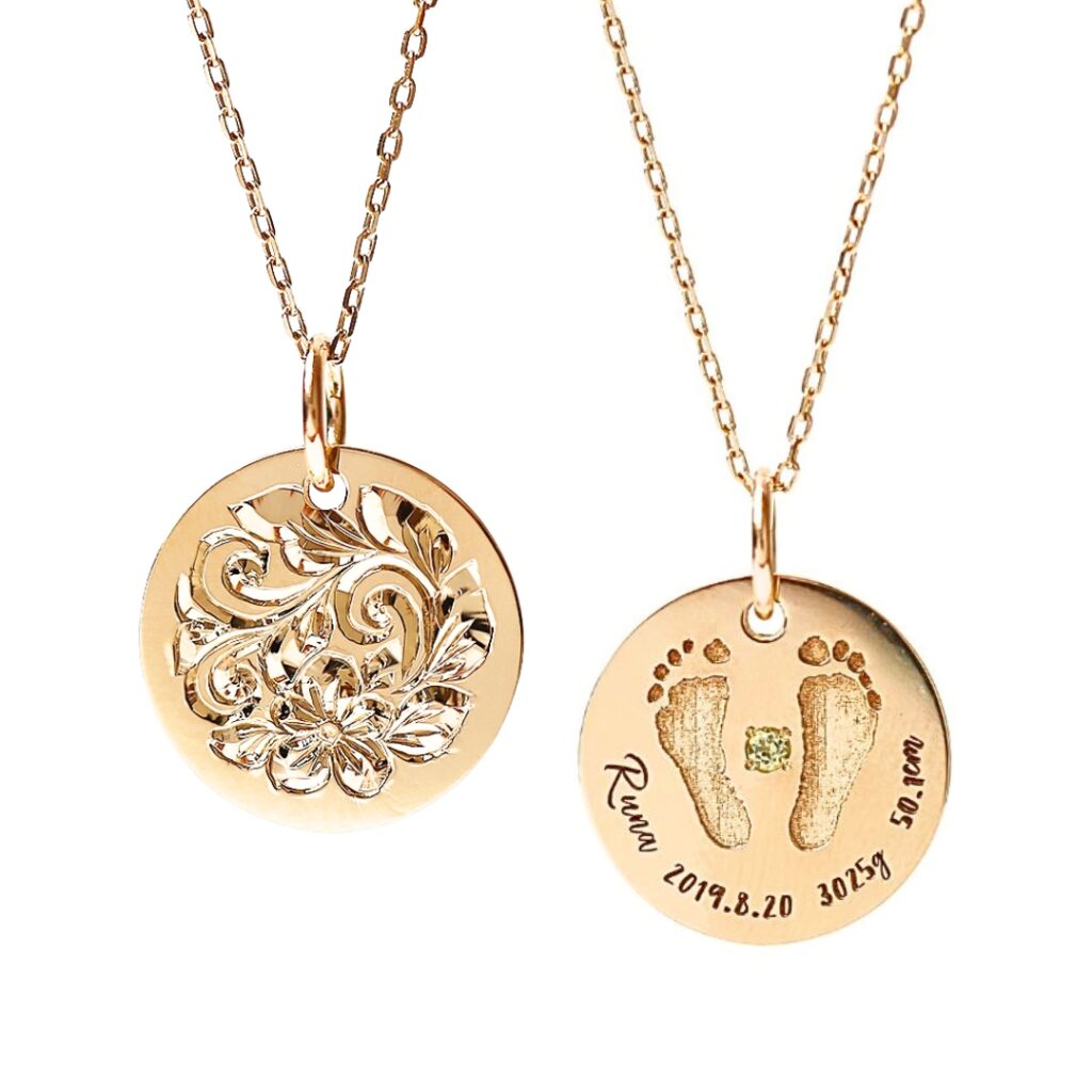 赤ちゃんの足型を刻印できる特別なコイン型ネックレス。