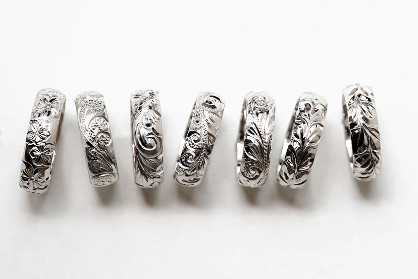 ひとつひとつの指輪には、ハワイの自然や祈りの象徴をモチーフにした彫り模様が刻まれます。