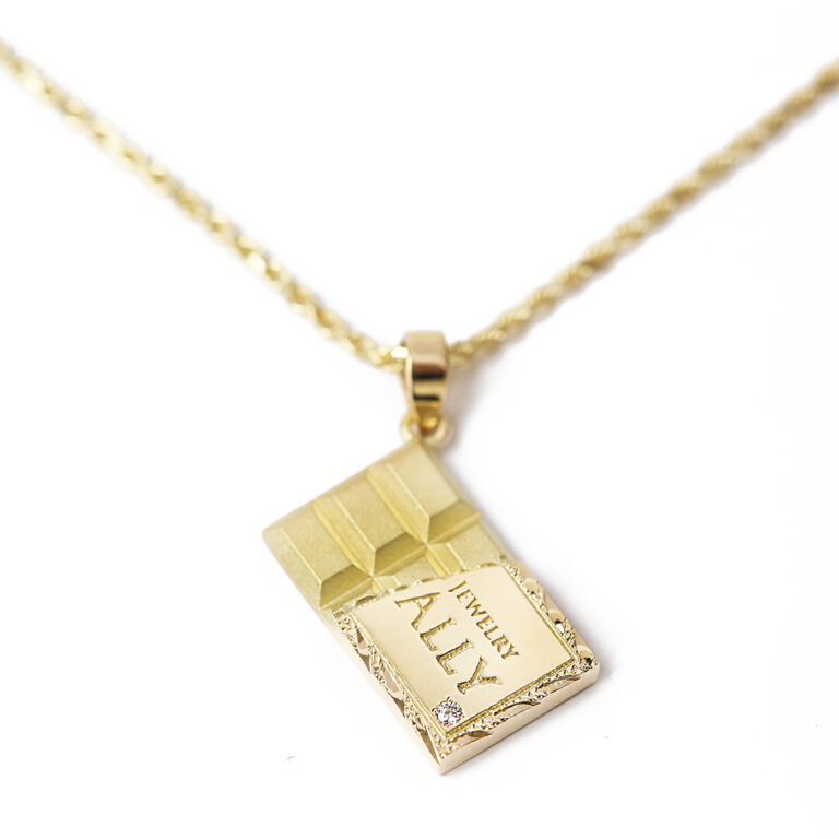 笑顔の女性がチョコレートモチーフネックレスを着用